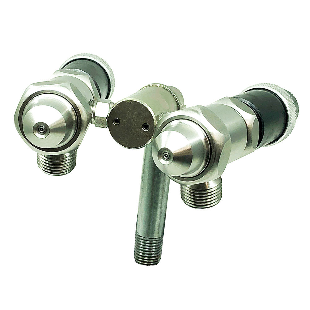 The A-LM-2-0 Dual Head Automatic Spray Gun is perfect for spraying application that require spraying two components that need to mix after spraying. Each spray head has it's own fluid hookup that can accept our USP-QT quart bottles or if you prefer hoses from your pressure pot. The wet sections are stainless steel so applications like silvering mirrors and chroming, that have corrosive fluids, can be sprayed. The sprayer will also work well for dual component adhesive applications. The sprayers activate with air pressure.