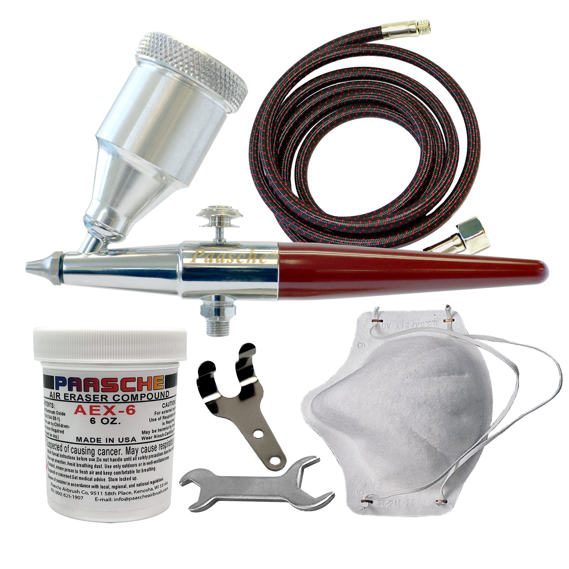 AEC etcher, 6 oz bottle of aluminum oxide, dust mask, 6' braided hose & Manual.