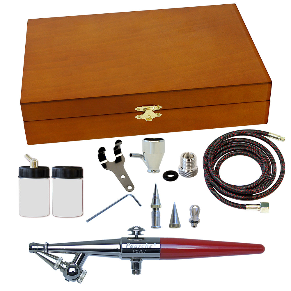 The H Single Action Airbrush comes packed in our deluxe wood case and features a durable, chrome-plated body and includes all three available spray heads, providing versatility for a wide range of applications. This airbrush allows users to achieve fine lines as narrow as 1/16 inch and spray patterns up to 1-1/2 inches wide. Its simple, user-friendly design requires minimal practice compared to double action models, making it ideal for basic spraying tasks such as solid coats, uniform lines, or stencil work.