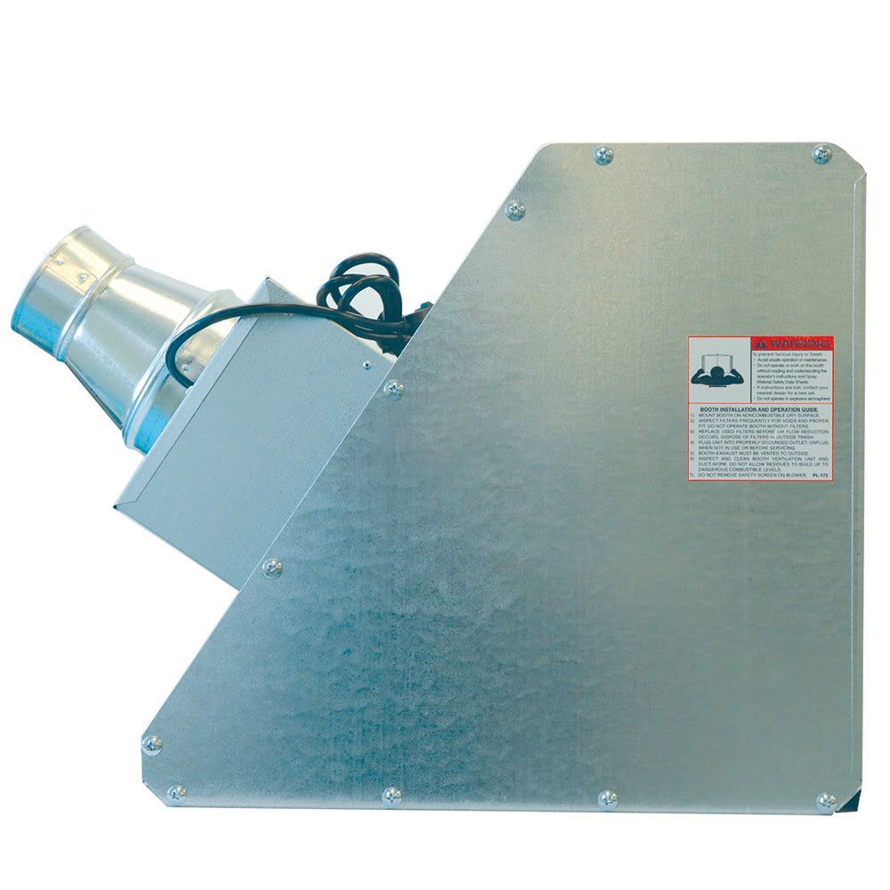 The integrated paint filter effectively captures paint particulates, while fumes can be safely exhausted using a 4" dryer duct (not included). The filter is easily replaceable for ongoing convenience. For safety, it is recommended to wear goggles and/or a protective paint and vapor mask during use. Please note: this booth is not intended for use with flammable paints.