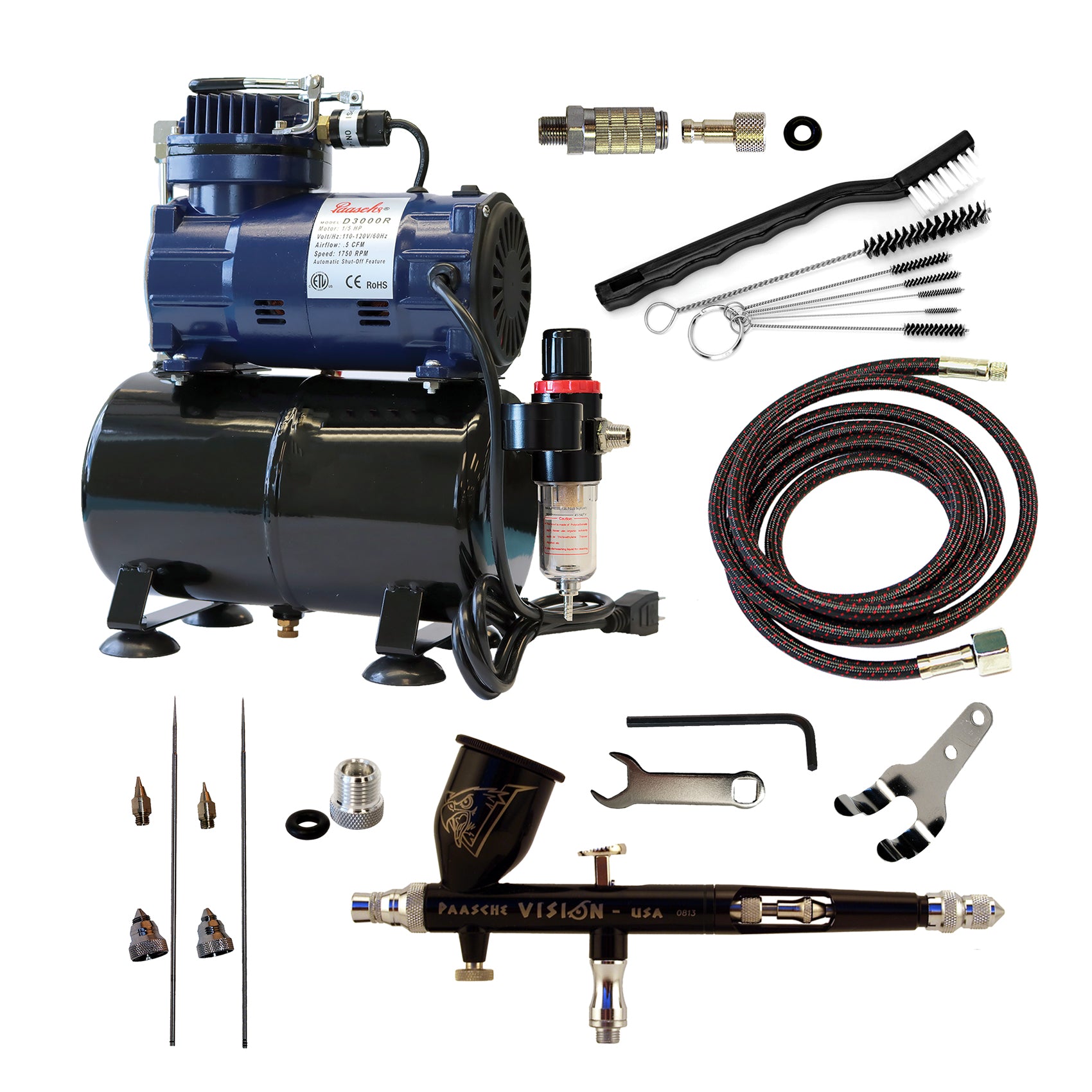 The Vision airbrush is the latest addition to the Talon line, designed for the finest detail work in Paasche’s range. It features an atomizing control knob, allowing users to achieve precise detail without adjusting compressor pressure. As part of the Talon series, it is compatible with all TG and TS airbrush heads. The Vision comes equipped with a new 0.2mm head, a hand-polished, hardened stainless steel needle, a sloped trigger, air atomization control, and a durable black chrome finish.