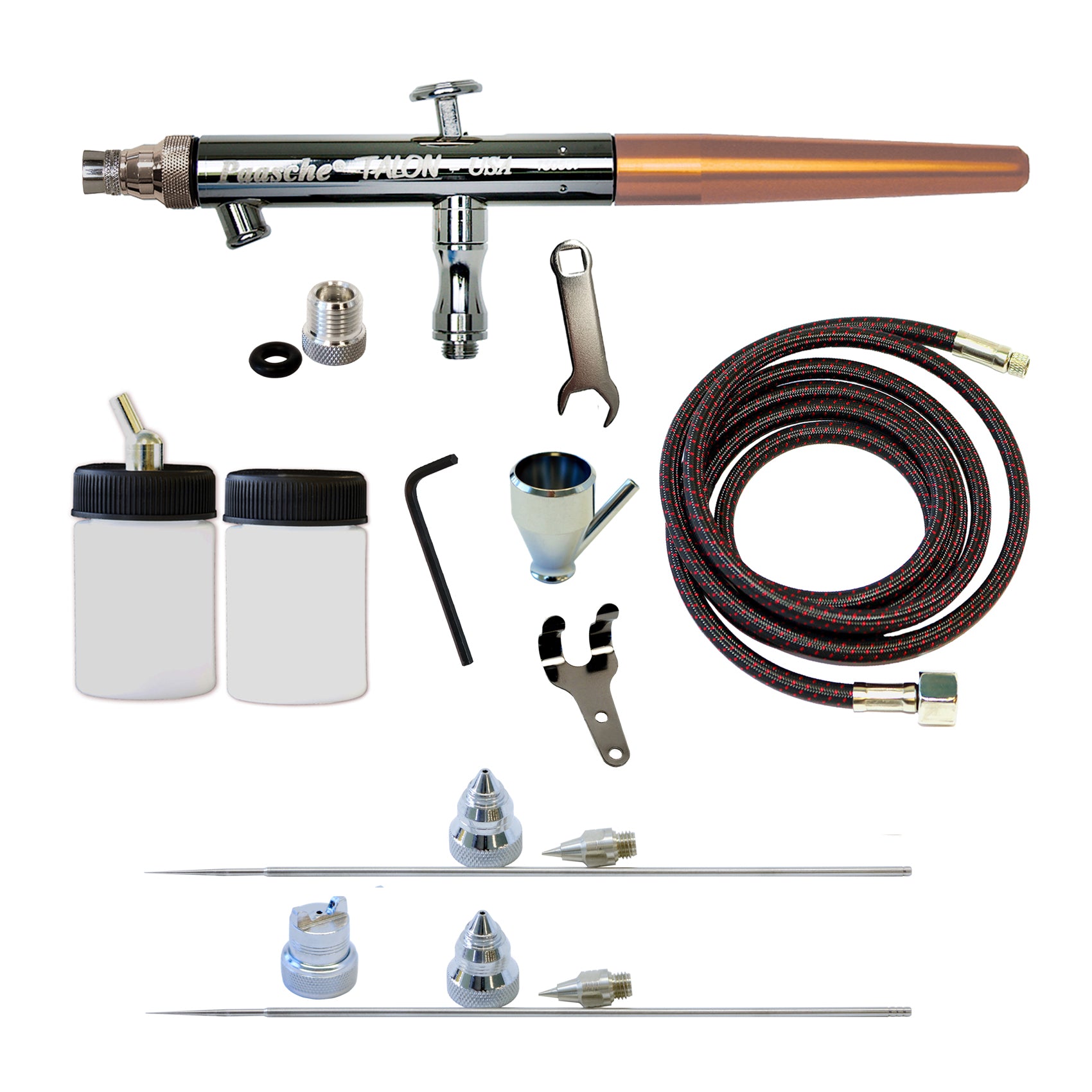 The TS-3AS airbrush features a robust chrome-plated body and an anodized aluminum cutaway handle for enhanced durability and comfortable handling. This model includes all three available spray heads—Size 1 (0.25mm), Size 2 (0.38mm), and Size 3 (0.66mm)—as well as a fan aircap, allowing for an impressive range of spray patterns. Achieve fine detail down to 1/64 inch or use the included fan head for broader patterns up to 3 inches wide.
